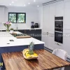 Gỗ công nghiệp có 2 thành phần là cốt gỗ (dăm gỗ hoặc bột gỗ ép dưới áp suất cao) và bề mặt gỗ (melamine, laminate, acrylic). Gỗ công nghiệp vẫn đang chiếm ưu thế trên thị trường bếp Việt bởi rất nhiều ưu điểm: mẫu mã phong phú, hiện đại; chịu lực, chịu nhiệt tốt; chống mối mọt, cong vênh, dễ vệ sinh.